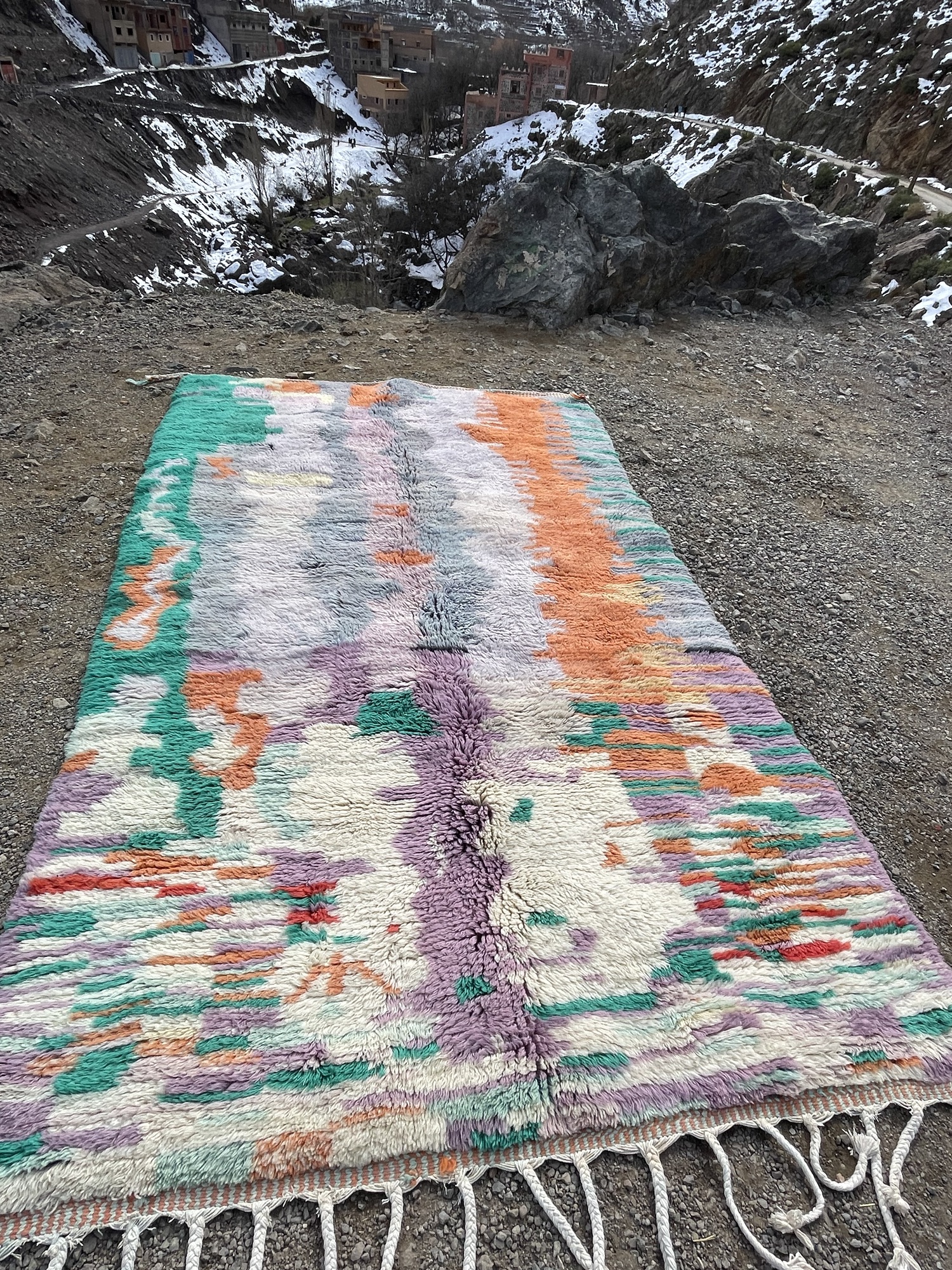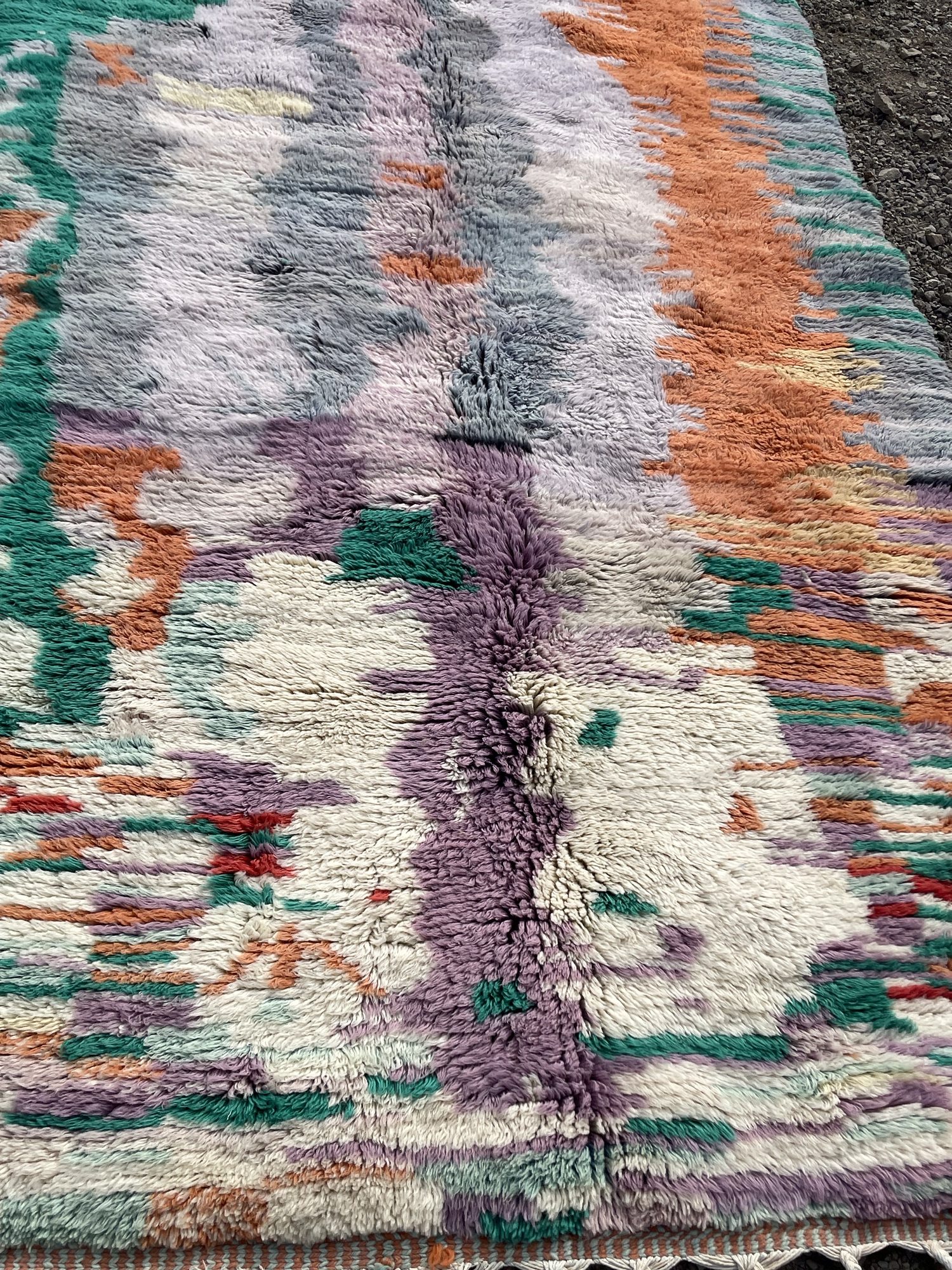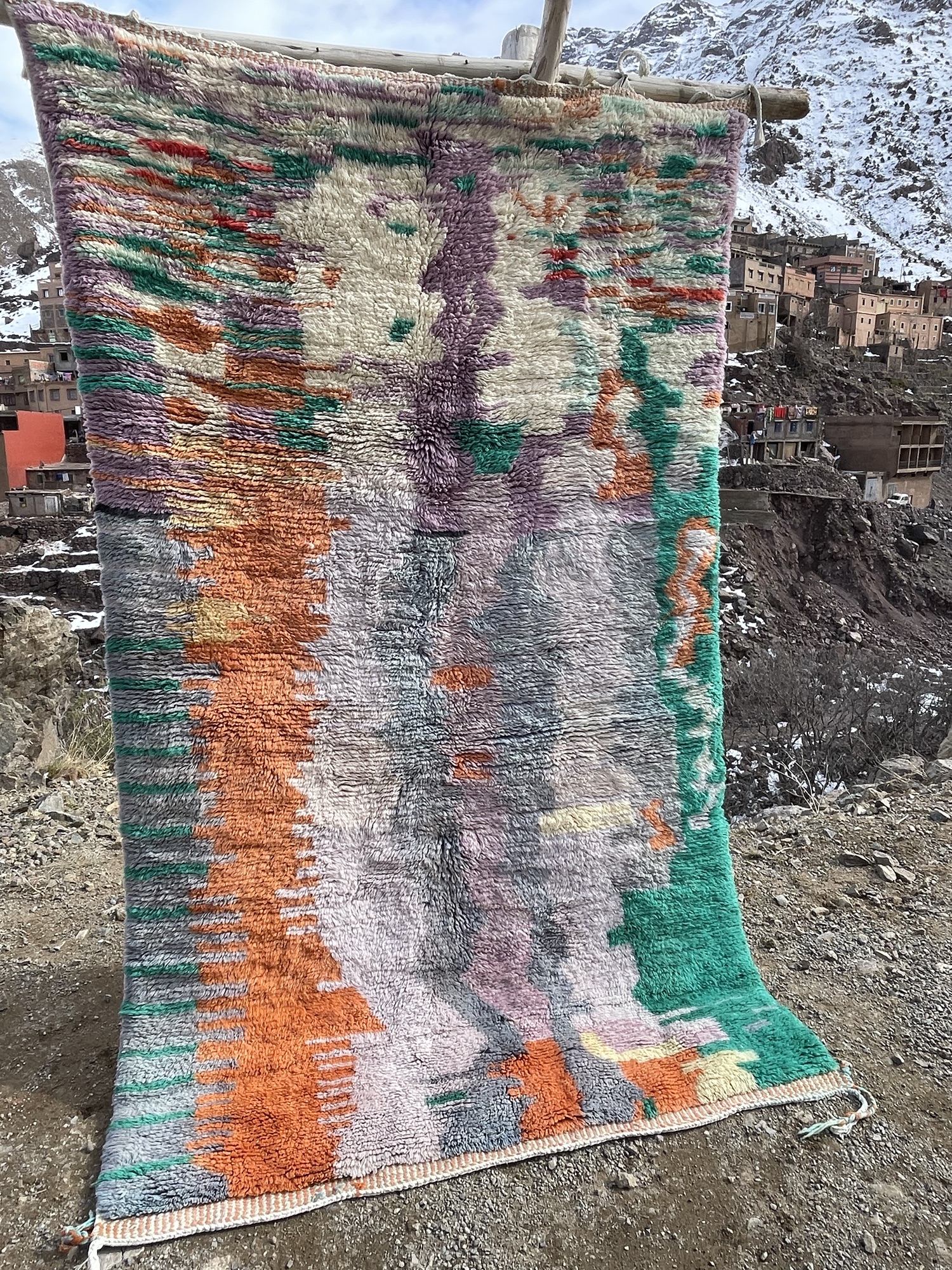 This authentic Moroccan Beni Ourain rug is a stunning example of Berber artistry, handwoven in the Atlas Mountains using 100% natural wool. Its expressive abstract pattern and vibrant color palette—blending orange, green, lavender, gray, and ivory—make it a true statement piece.