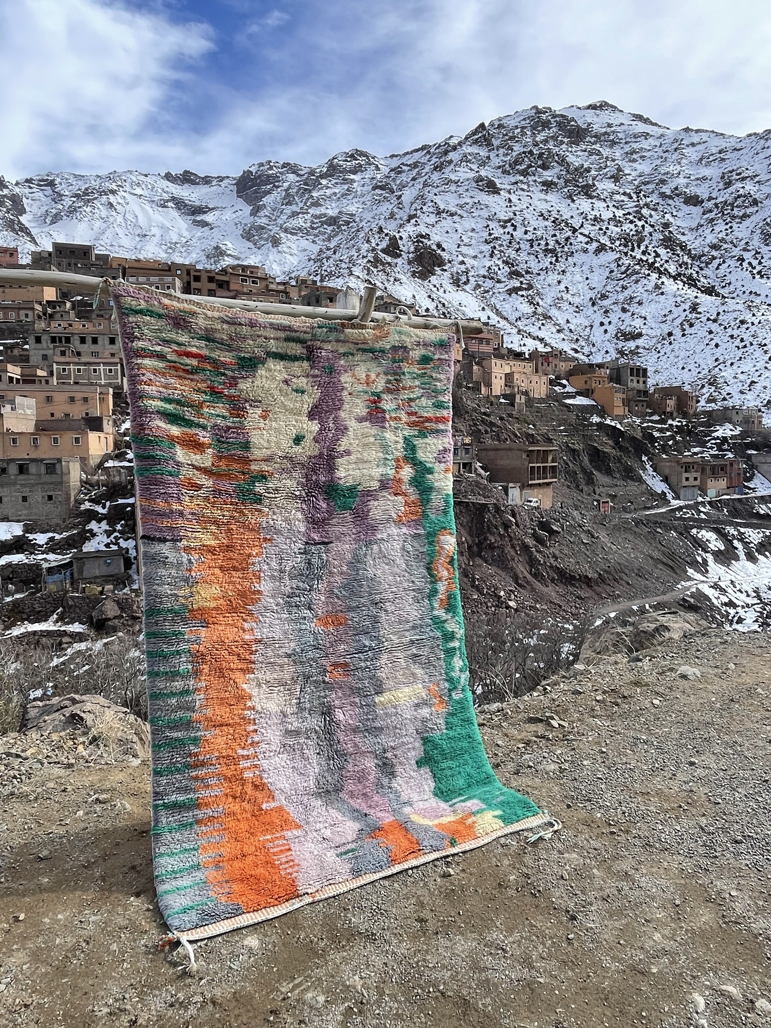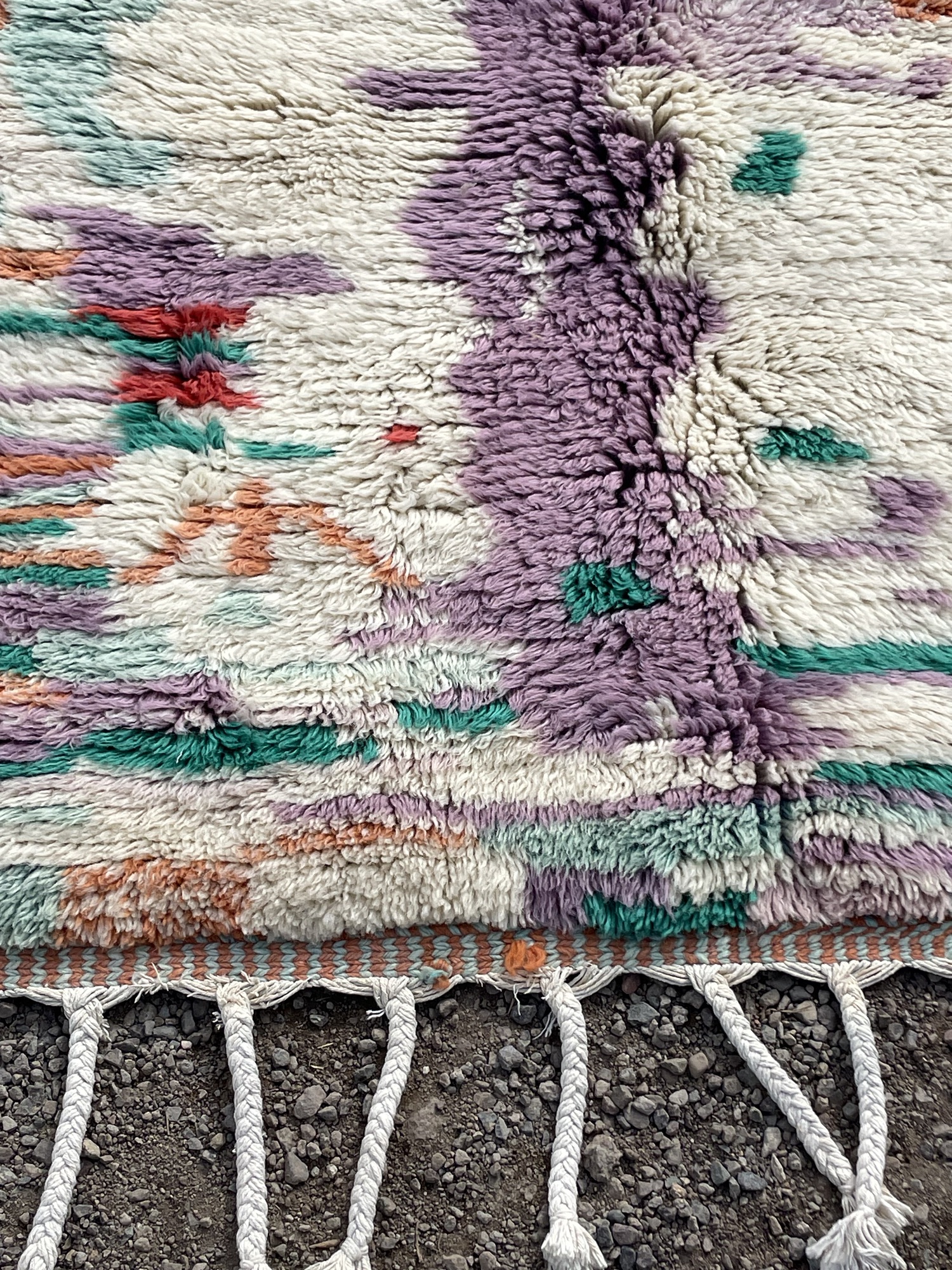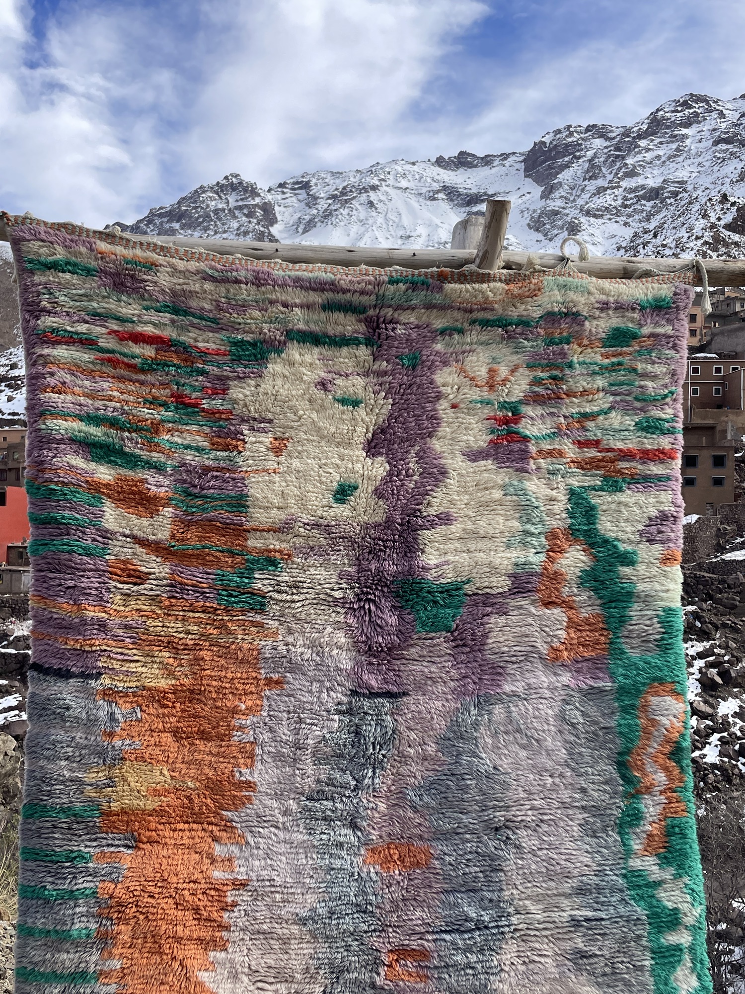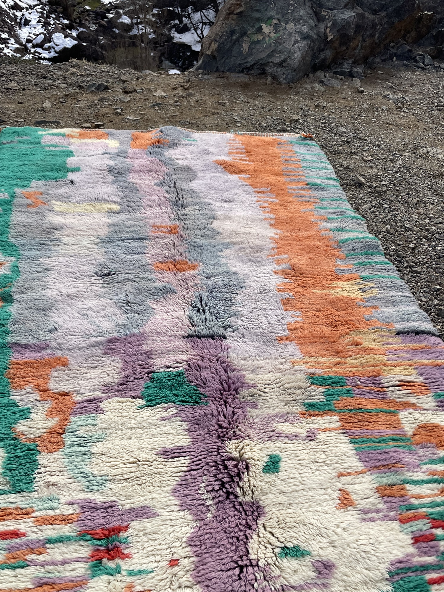 This authentic Moroccan Beni Ourain rug is a stunning example of Berber artistry, handwoven in the Atlas Mountains using 100% natural wool. Its expressive abstract pattern and vibrant color palette—blending orange, green, lavender, gray, and ivory—make it a true statement piece.