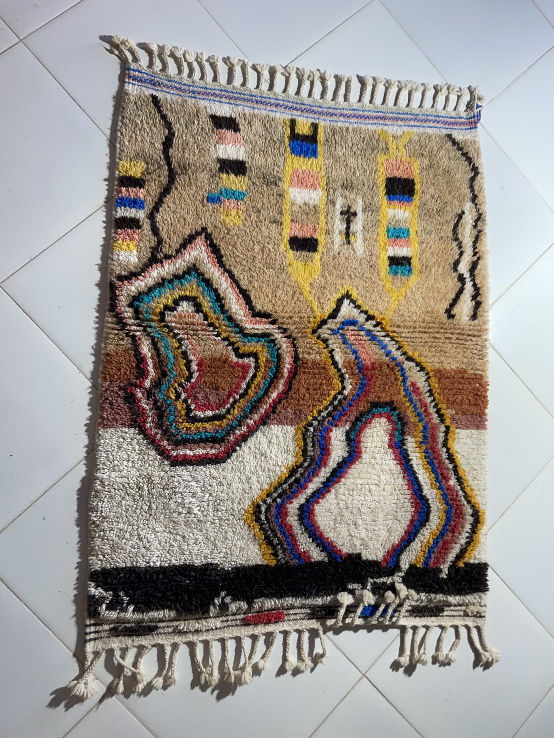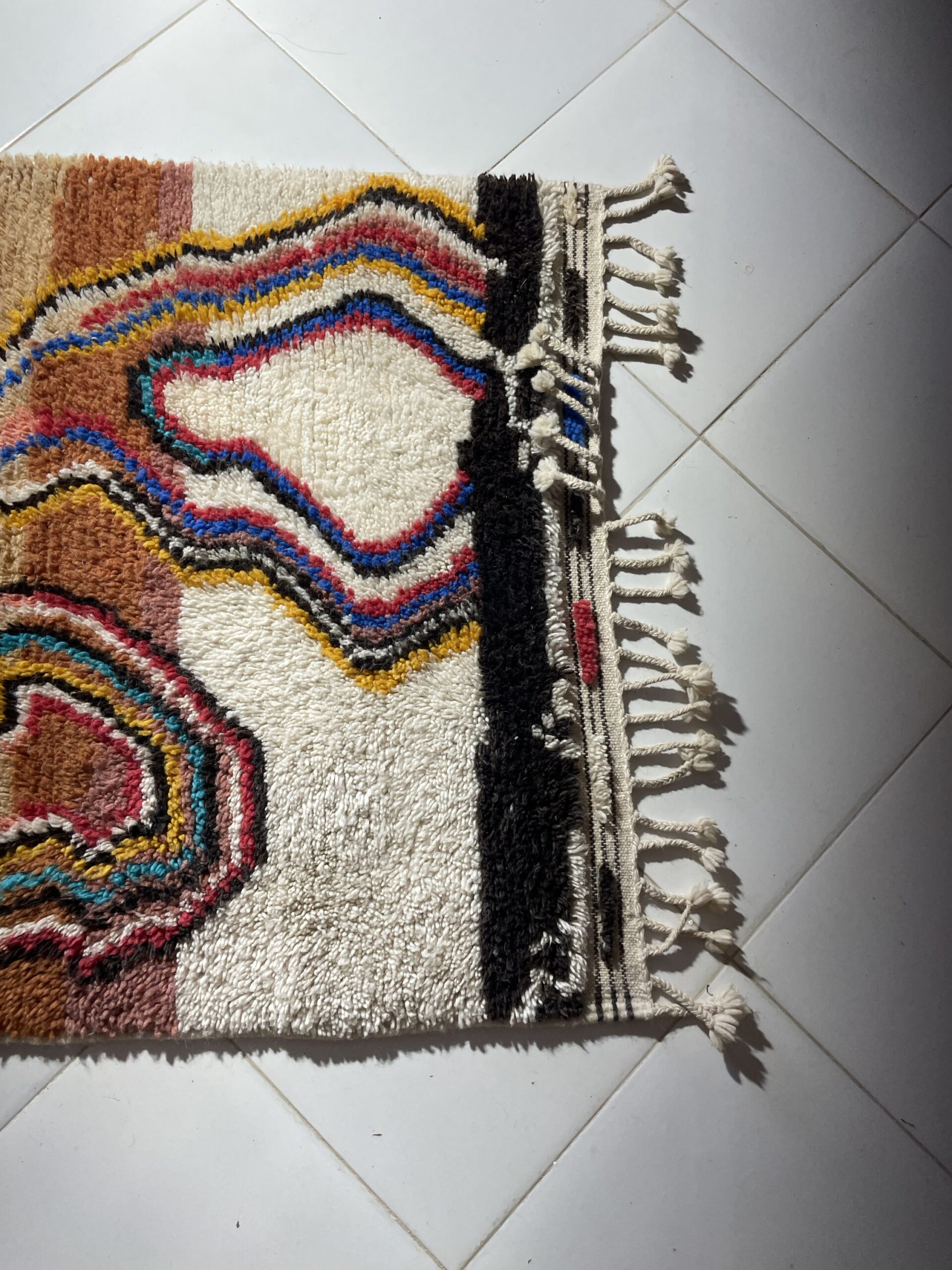 Each authentic Azilal rug is a one-of-a-kind treasure made by Berber artisans in the High Atlas Mountains. The hand-knotted wool and spontaneous patterns create a vibrant expression of Moroccan tradition.