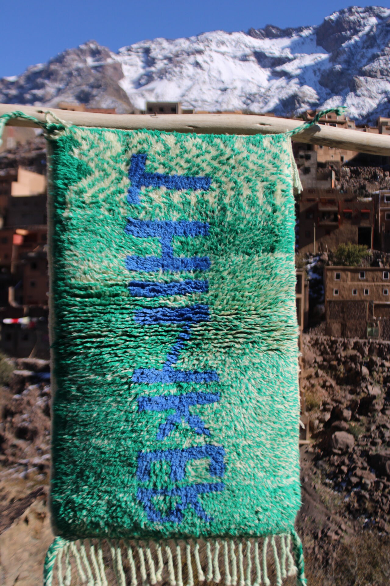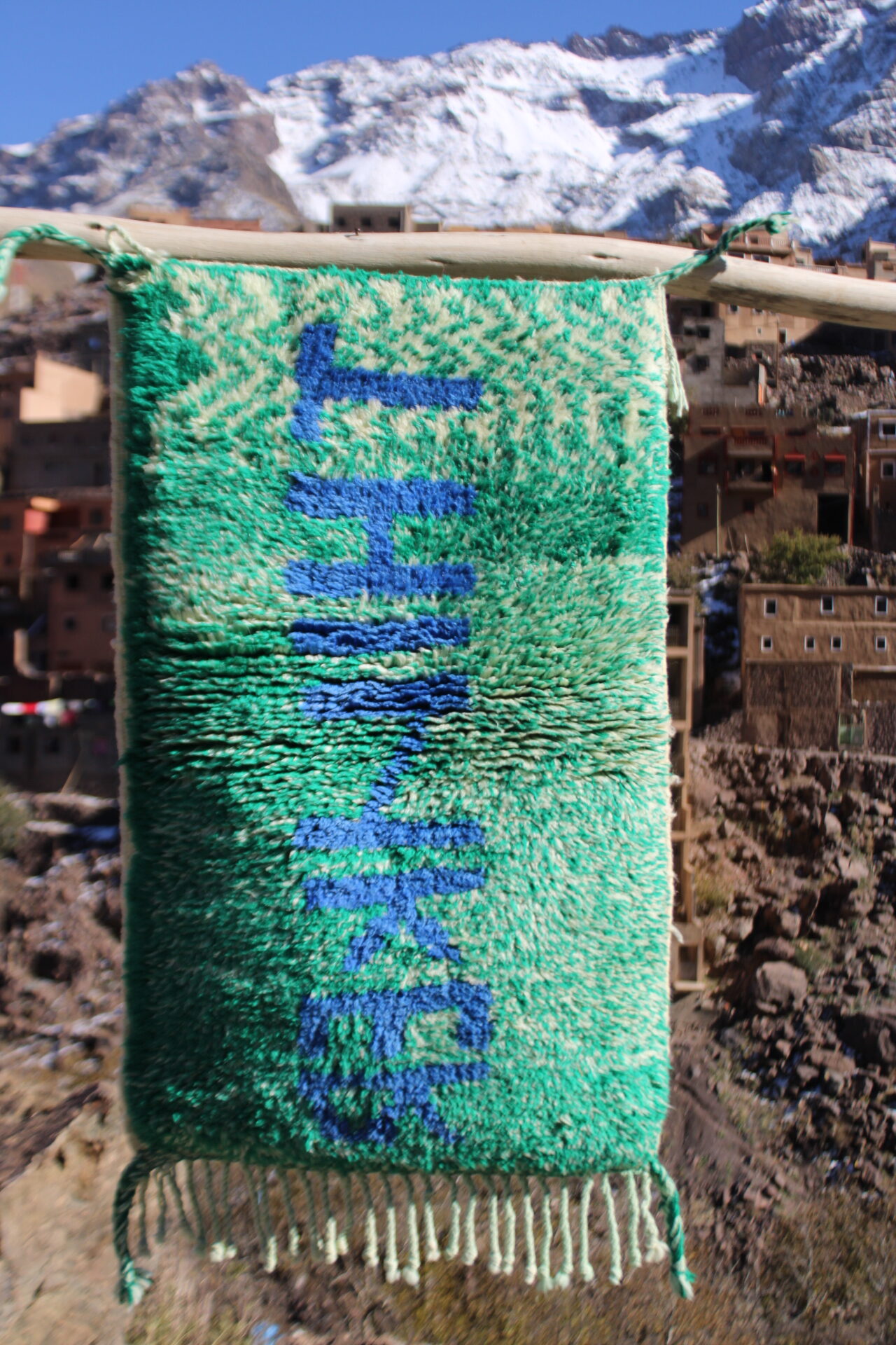 A unique handmade Berber rug featuring the word “HOPE” woven in warm orange tones. Crafted by artisans in the Atlas Mountains, this piece blends modern design with traditional Moroccan craftsmanship. Perfect as wall décor or a small accent rug.