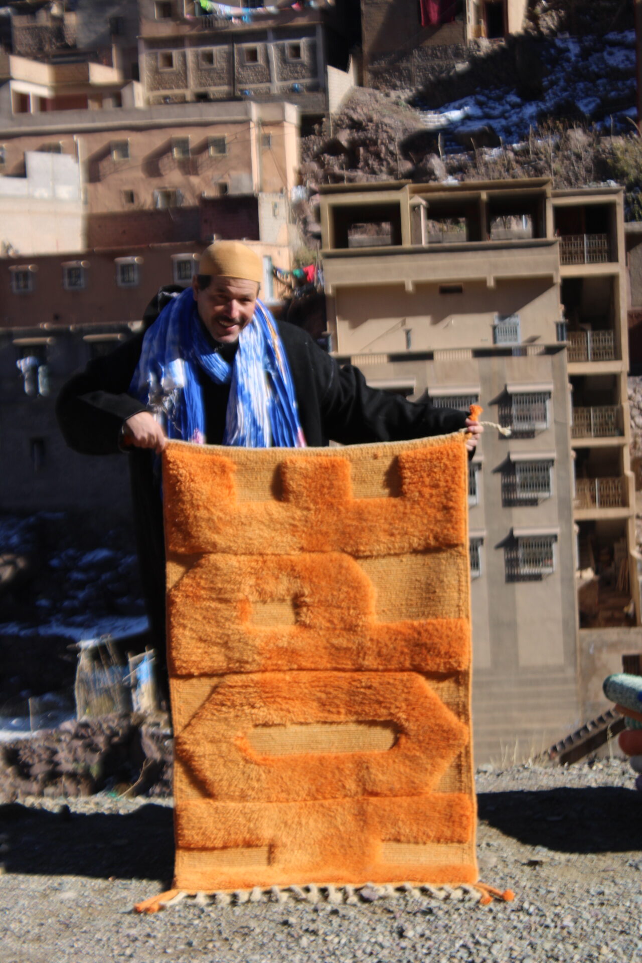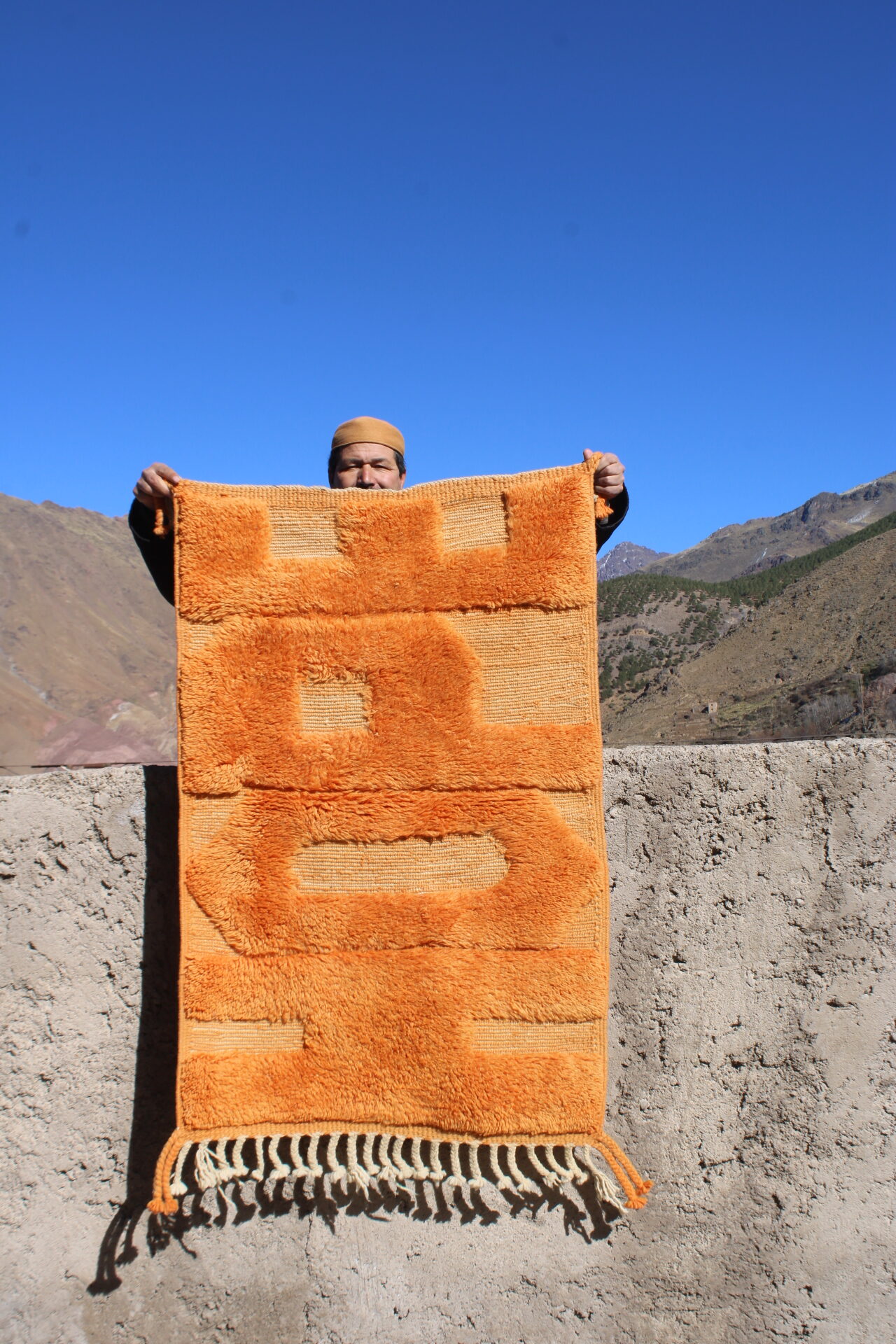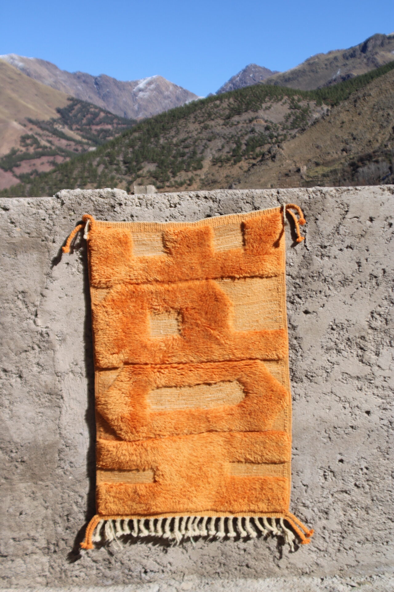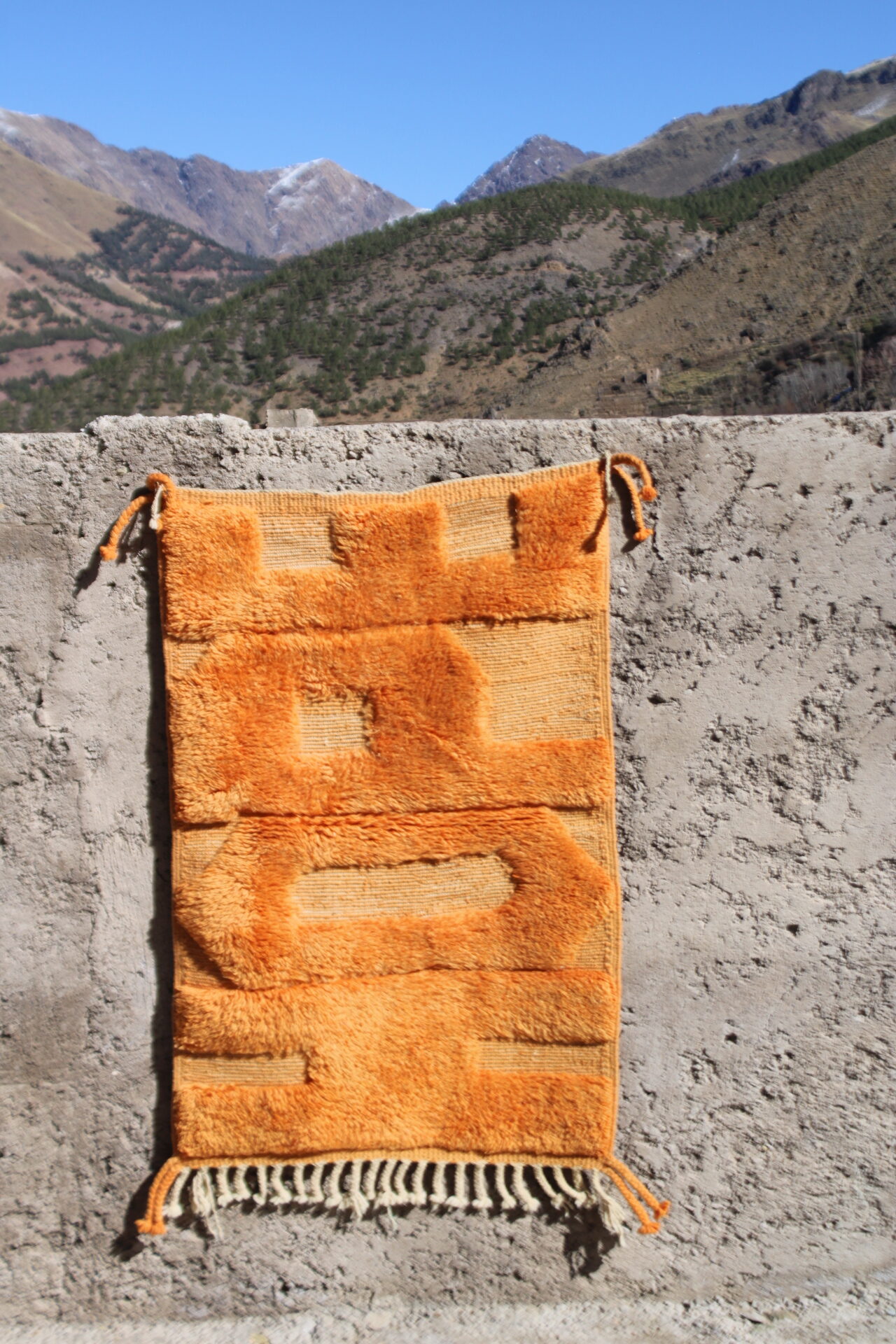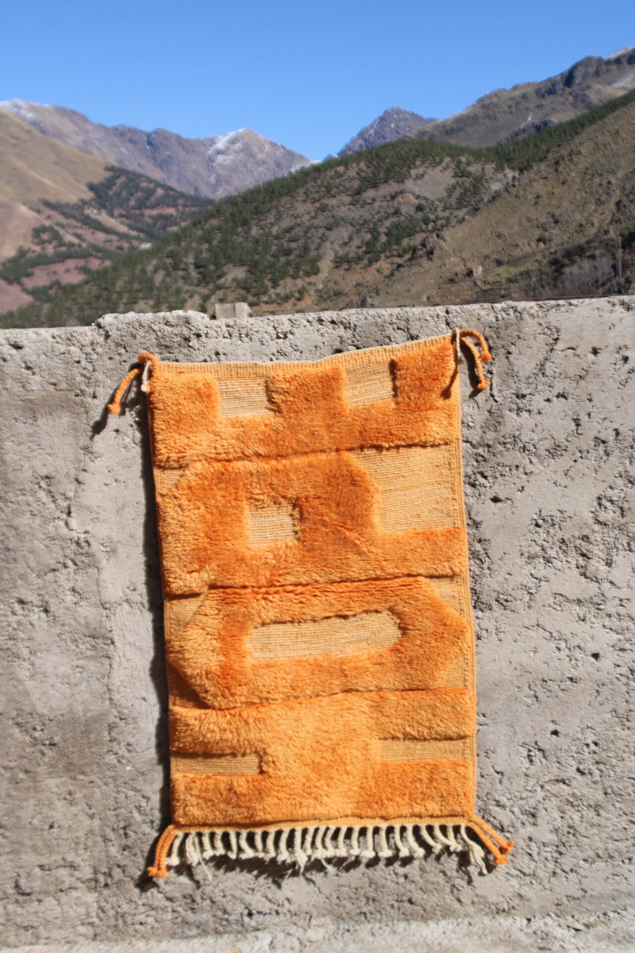 A handmade Moroccan HOPE rug crafted in the Atlas Mountains. This orange woven tapestry brings warmth, texture, and meaning to any home. Perfect as wall art, decor, or a unique ethical gift. Handwoven by artisans in Imlil using traditional Berber techniques.