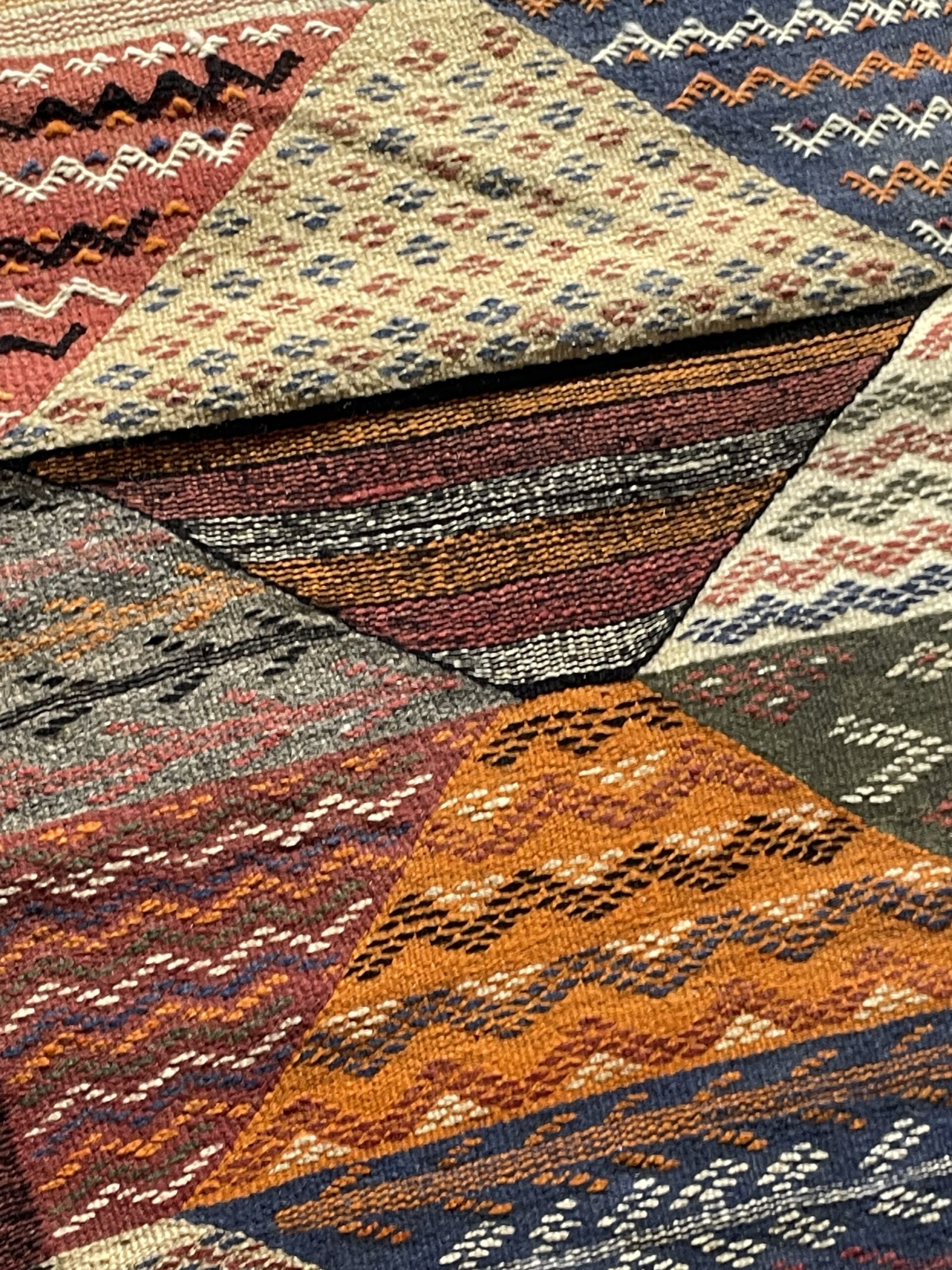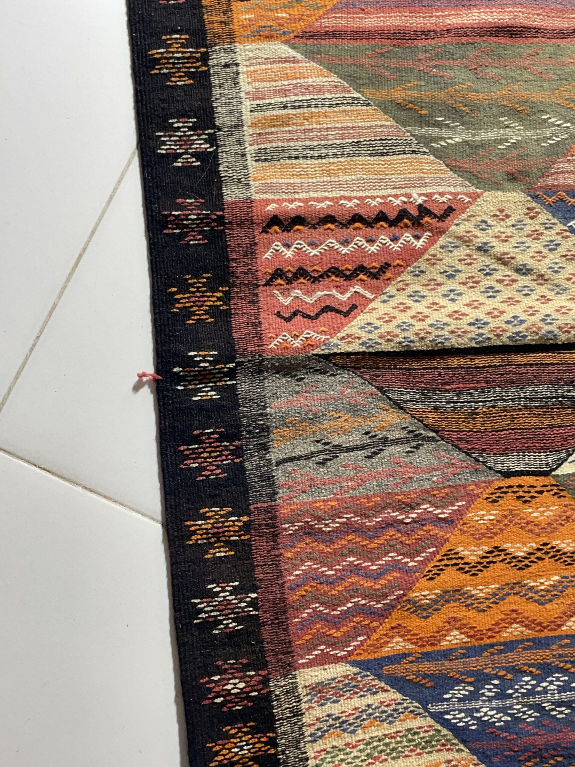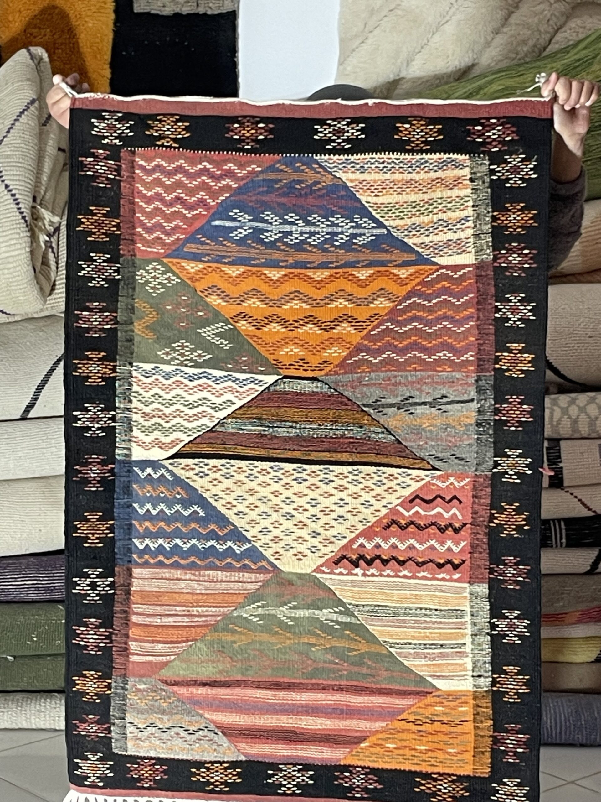 This Moroccan Handmade Picasso Kilim rug is a unique art piece woven by Berber artisans using traditional techniques passed down for generations. With a practical size of 120×70 cm (3.94×2.30 ft), it serves beautifully as a bedside rug, office accent, entryway mat, or wall hanging.