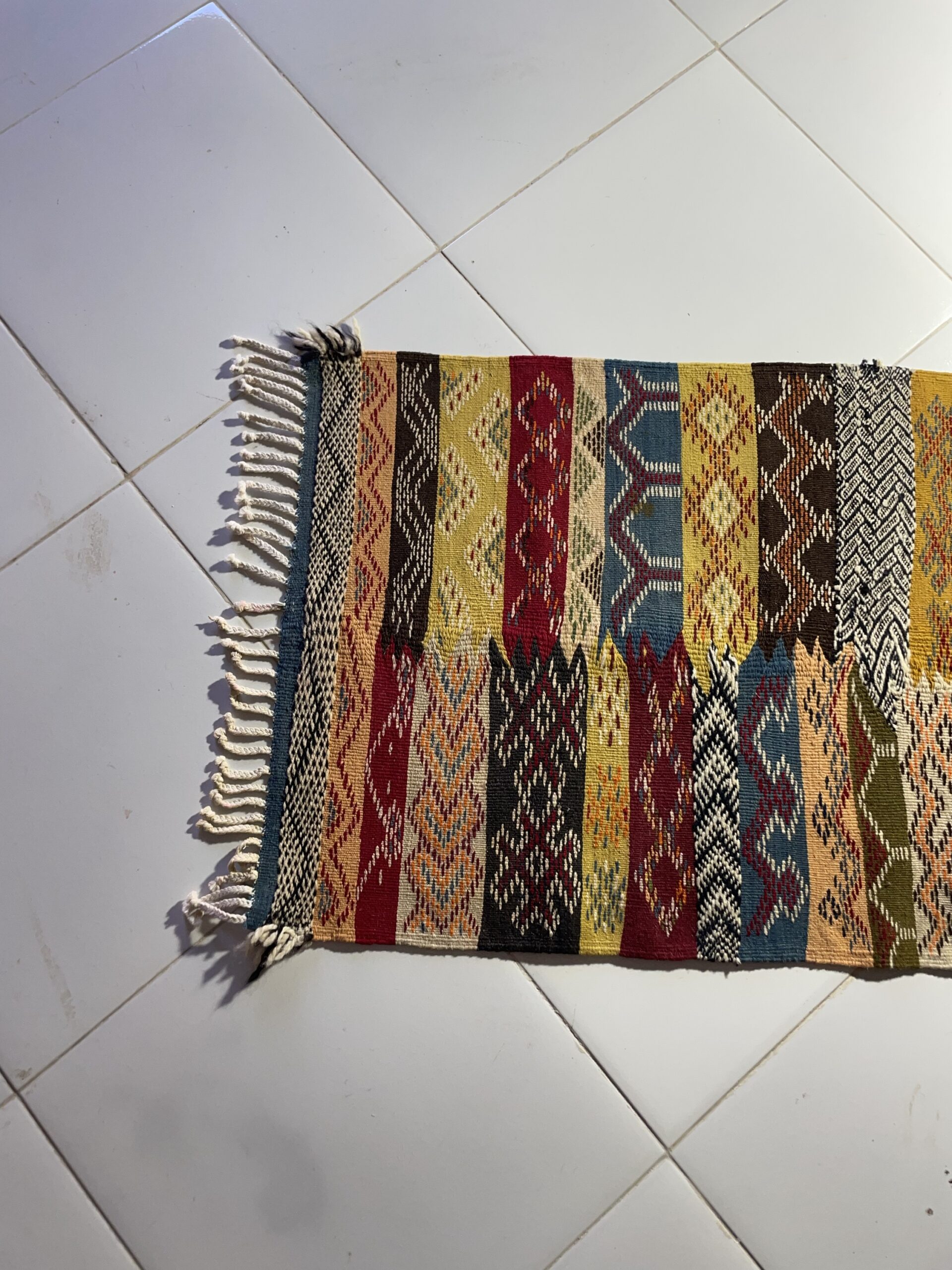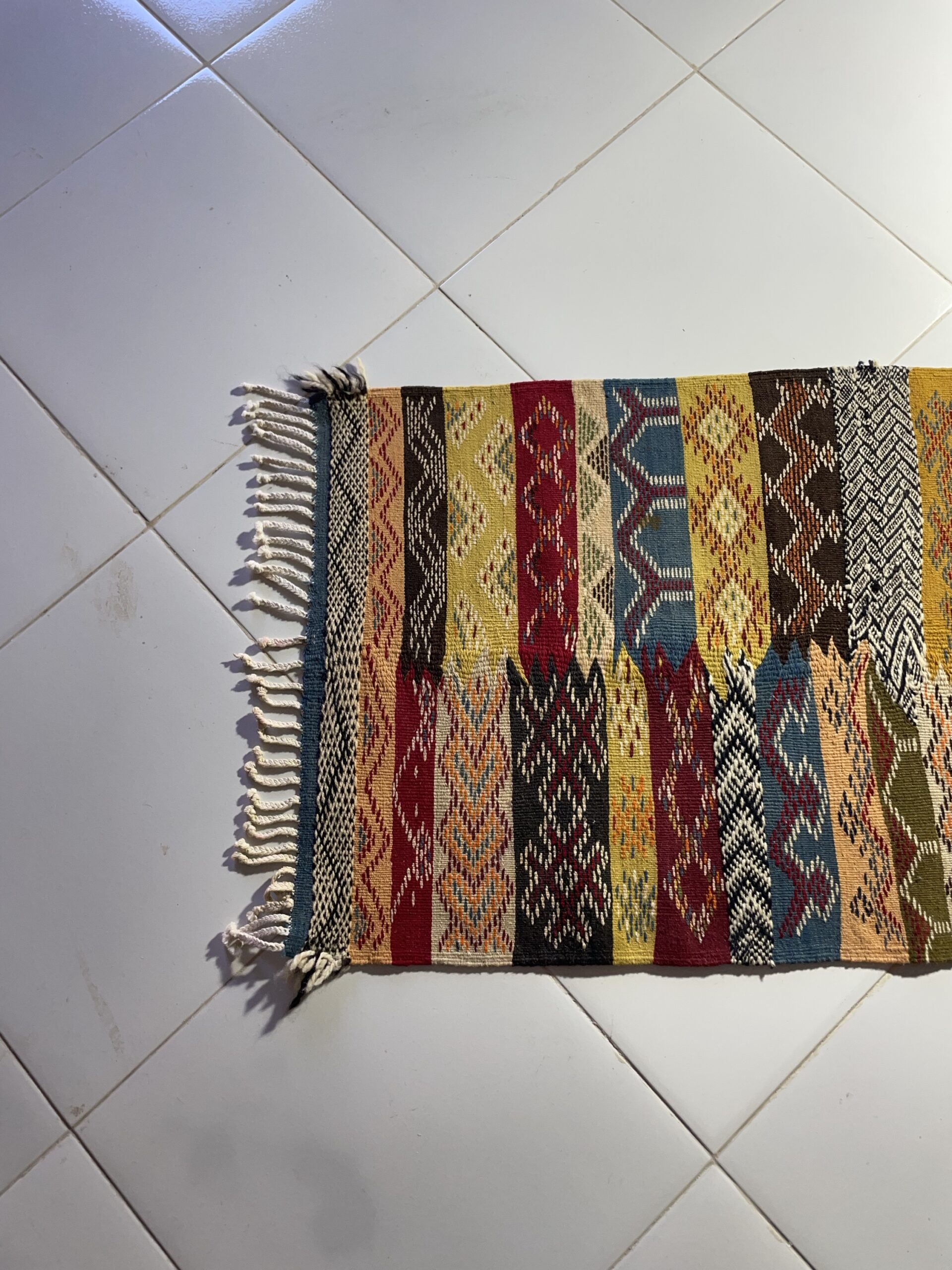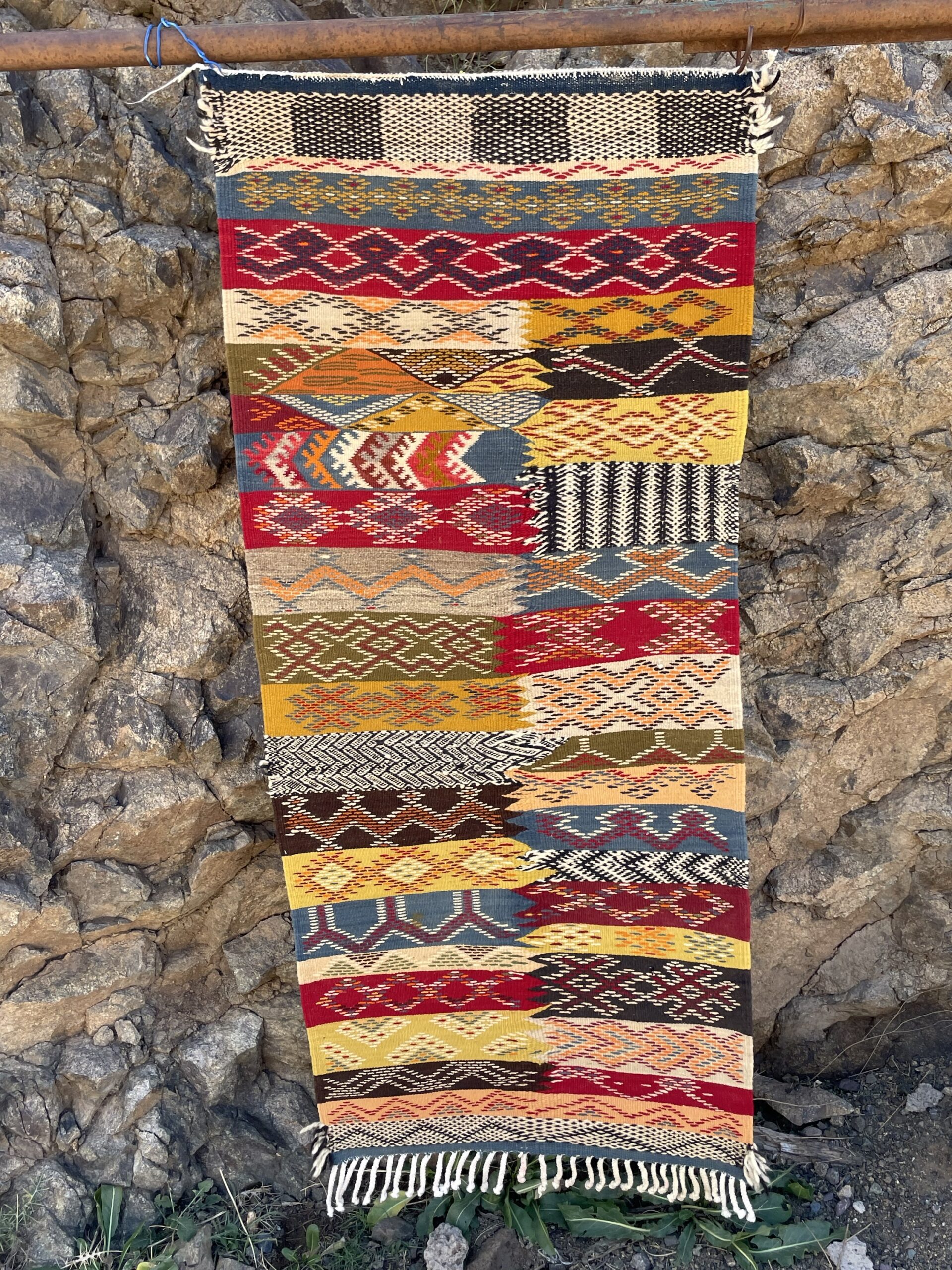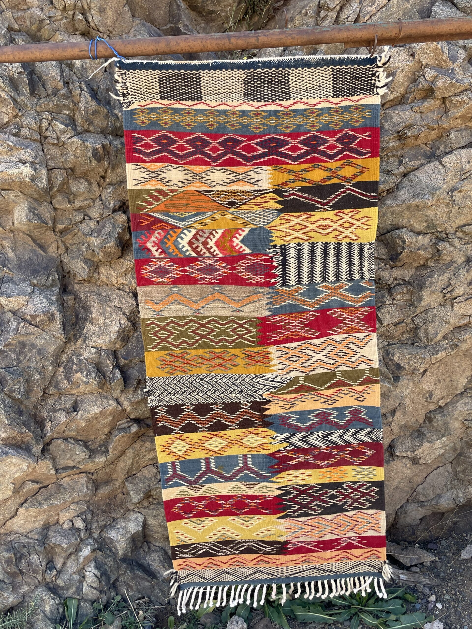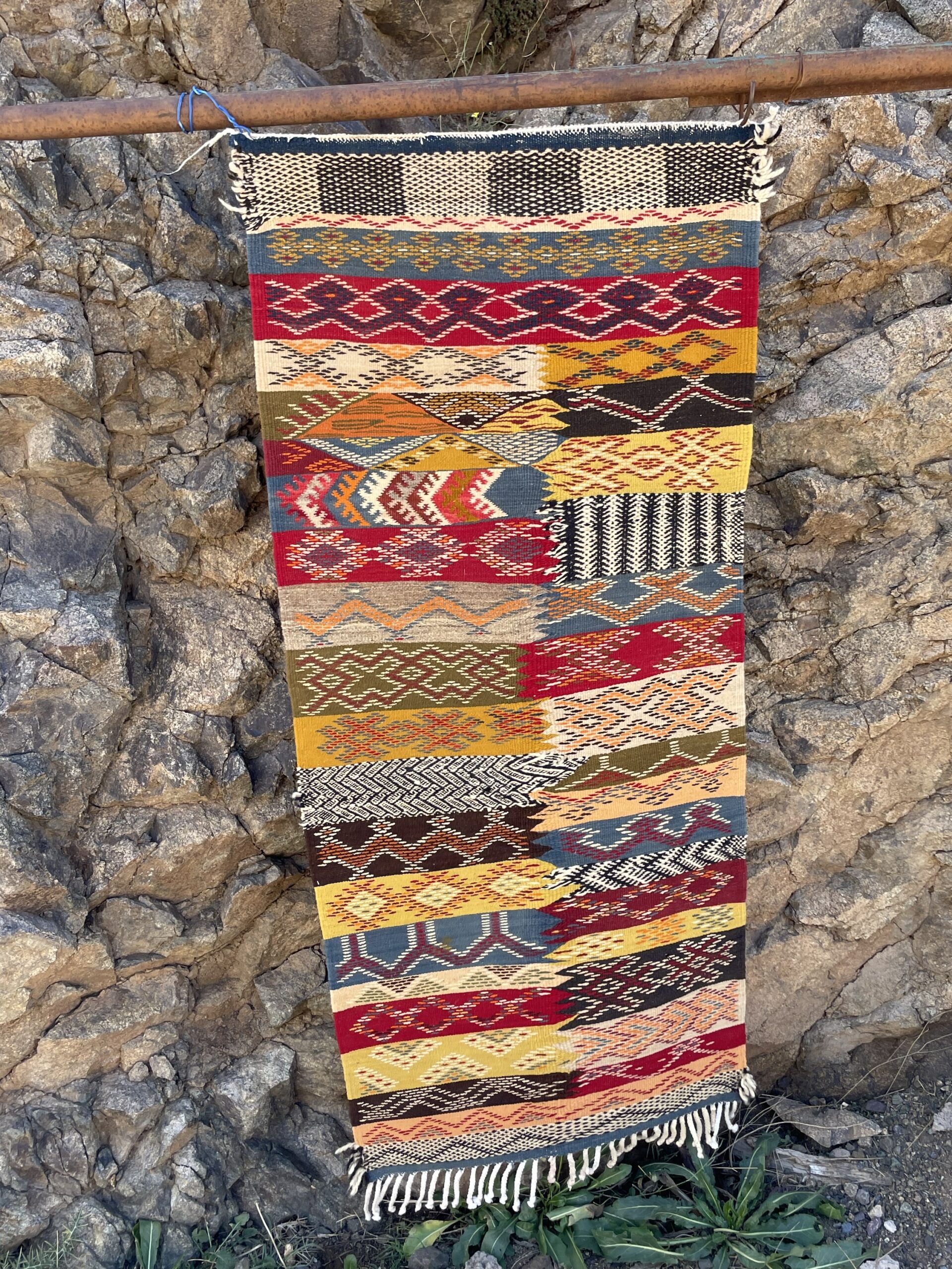 This beautiful Berber Picasso rug is a newer style of flatweave rug. It is densely woven and reversible, showcasing a vibrant rainbow of colors. One side features an indigo border with fringe on one end, while the other end has a slightly scalloped edge. The one-of-a-kind pattern is a unique creation from the weaver’s imagination. Made from 100% wool.