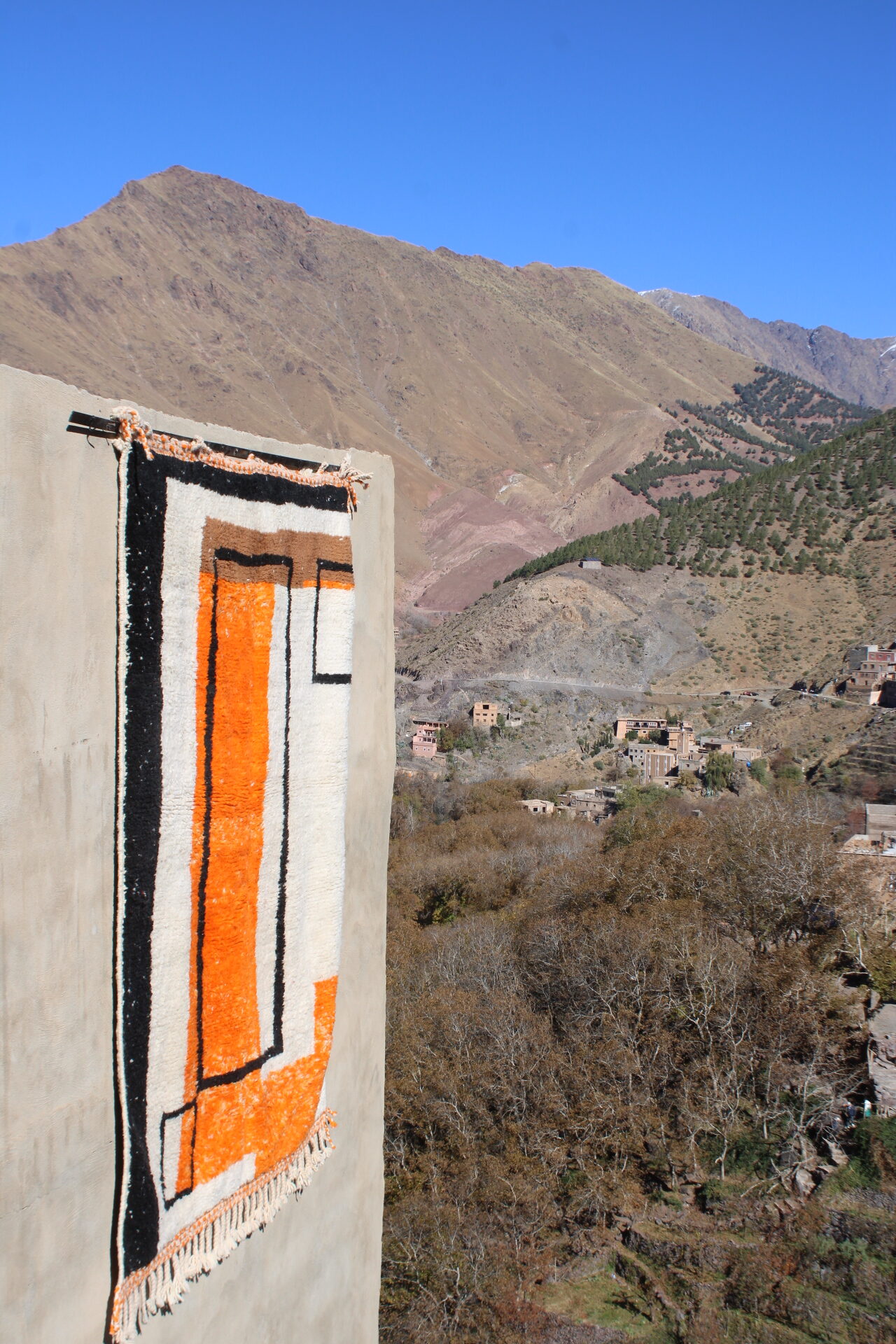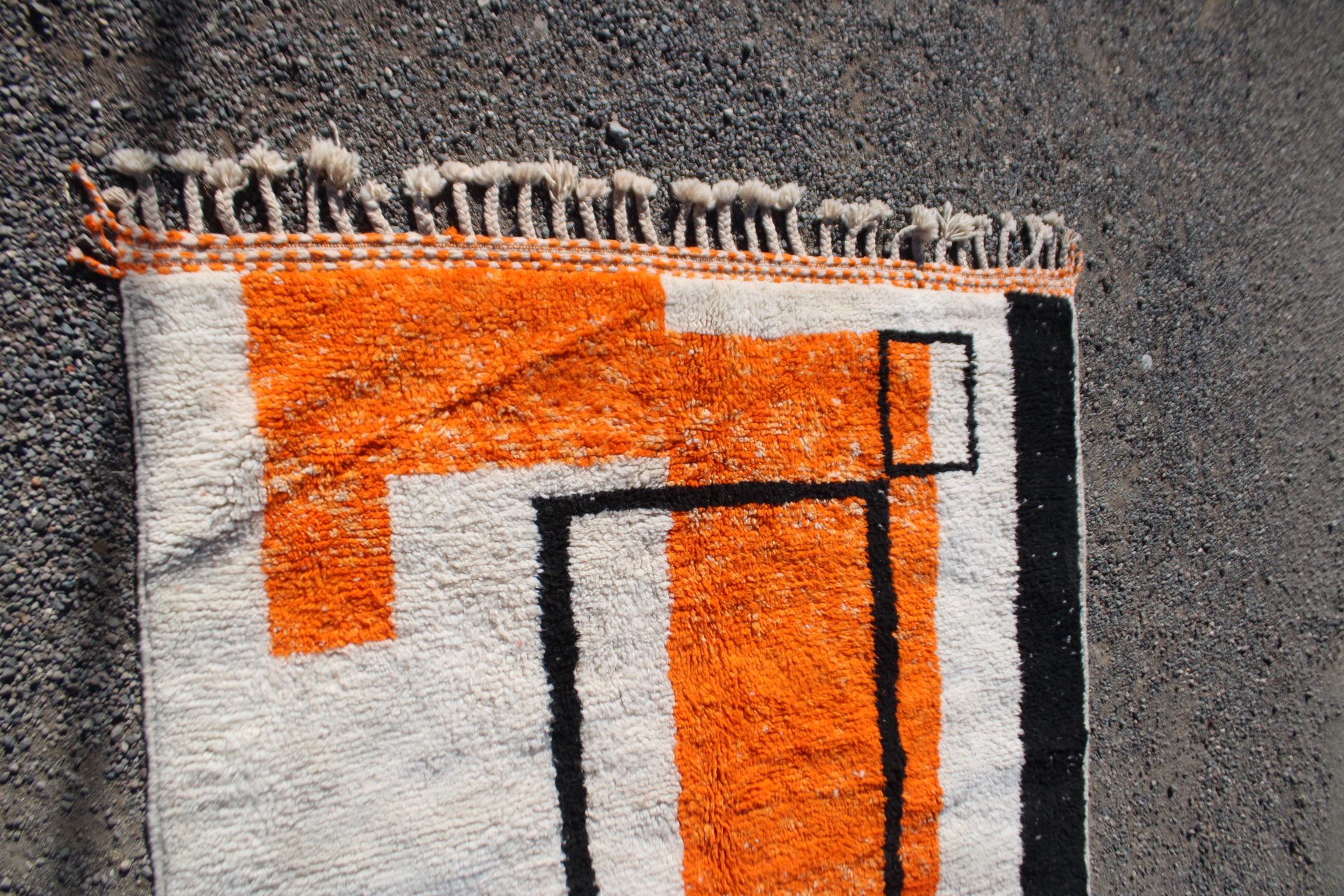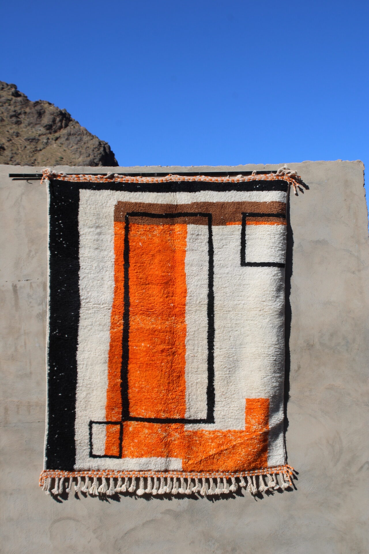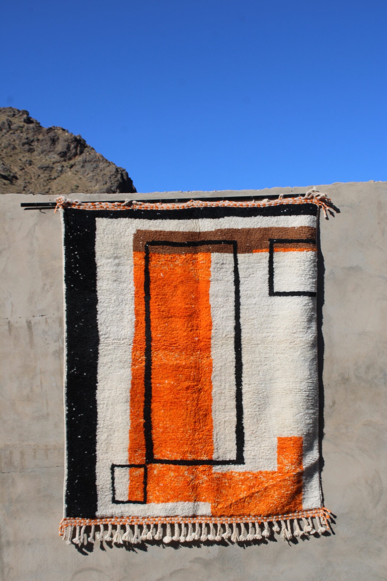 The Siwe rug is a handwoven Moroccan wool masterpiece created by the skilled artisans of Cooperative Adrar in the High Atlas region. Measuring 200×150 cm (6.5×5 ft), this contemporary Berber rug features bold geometric lines and vibrant orange, black, and earthy tones—perfect for adding warmth and character to any space.