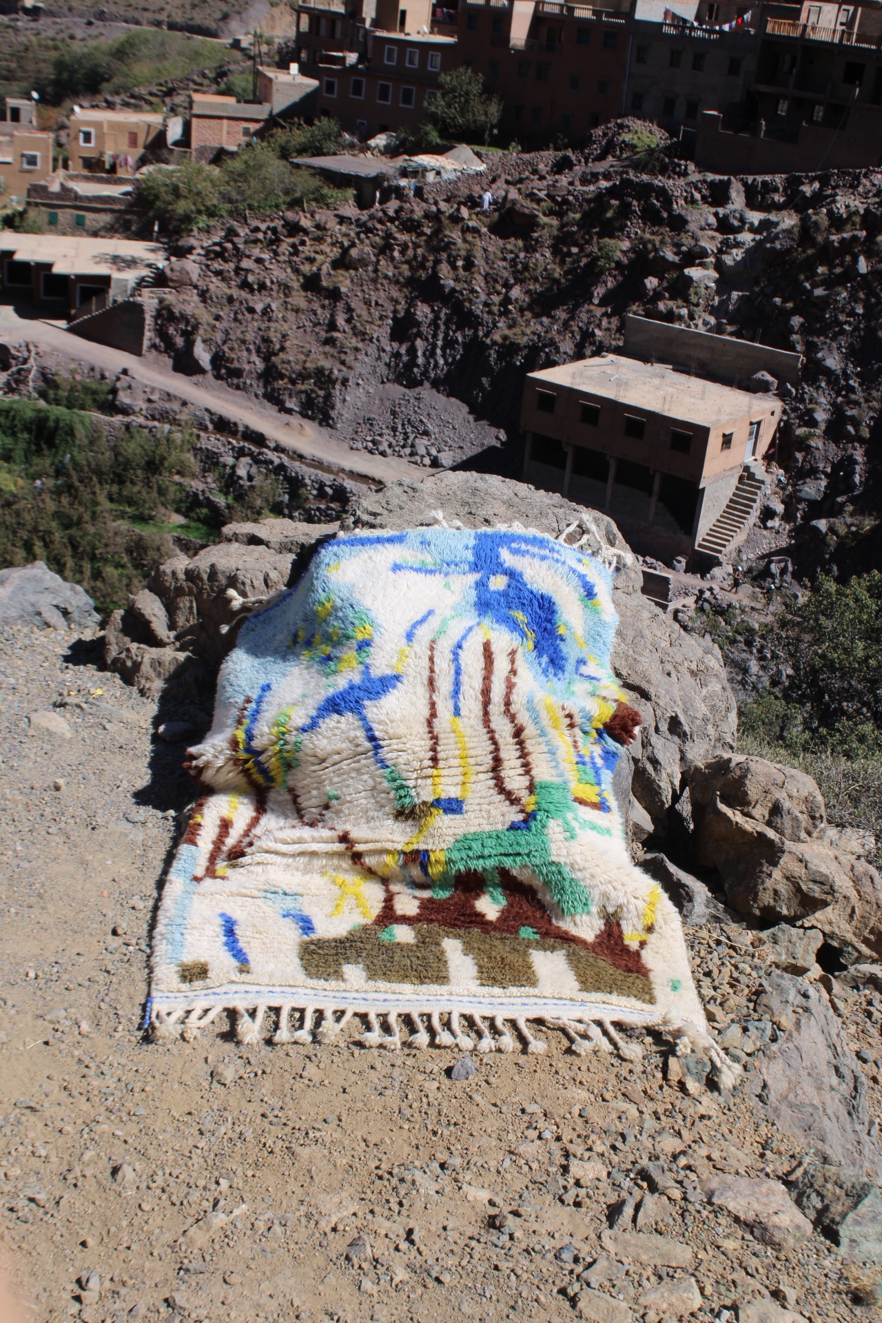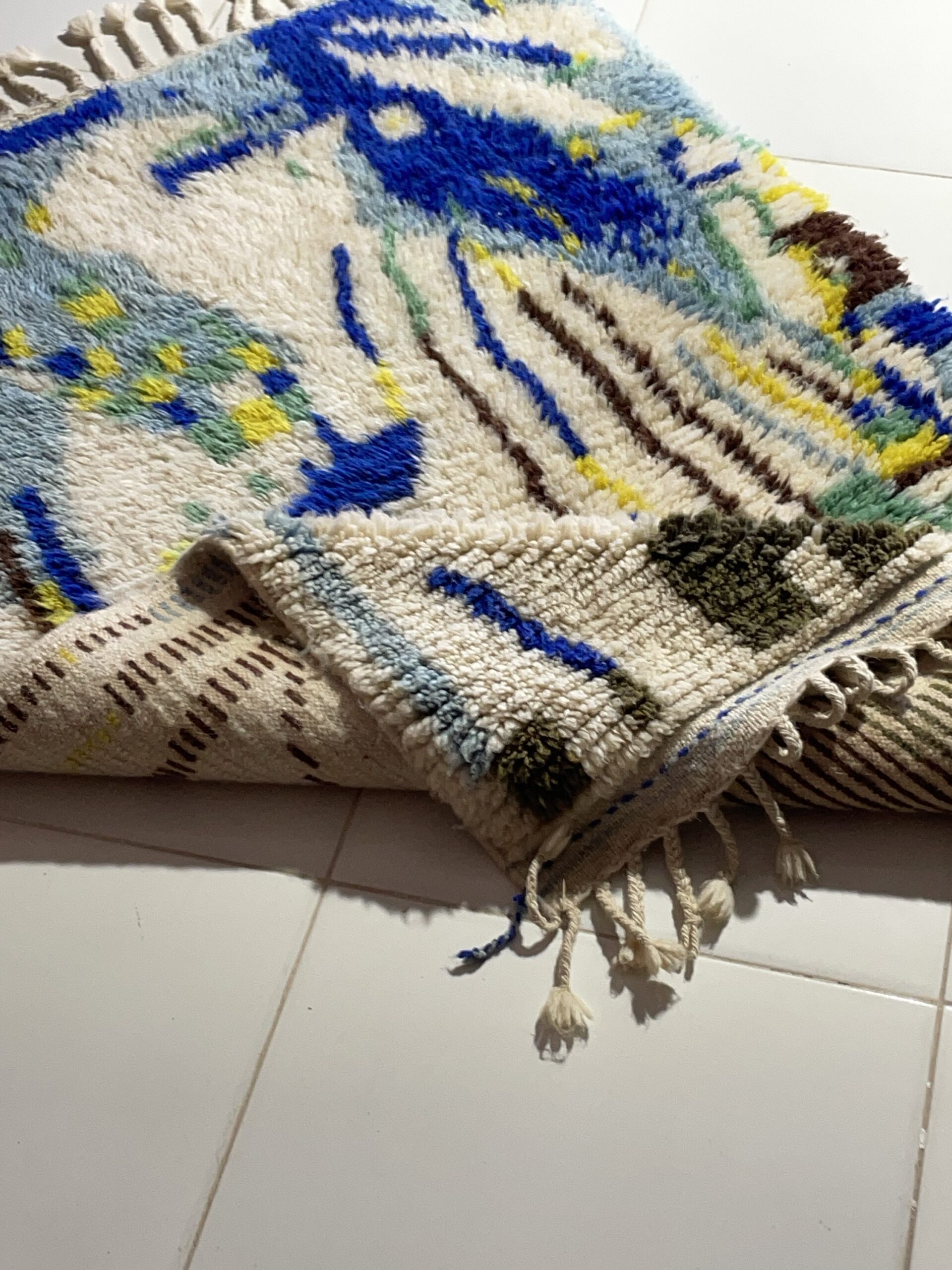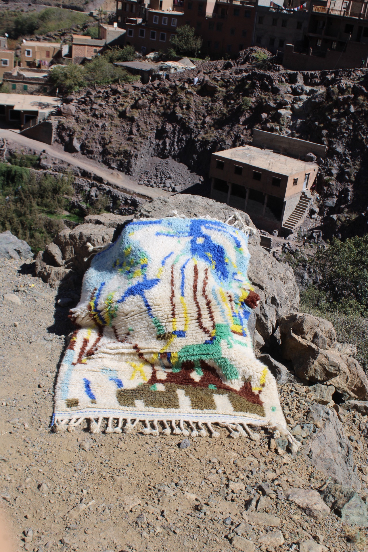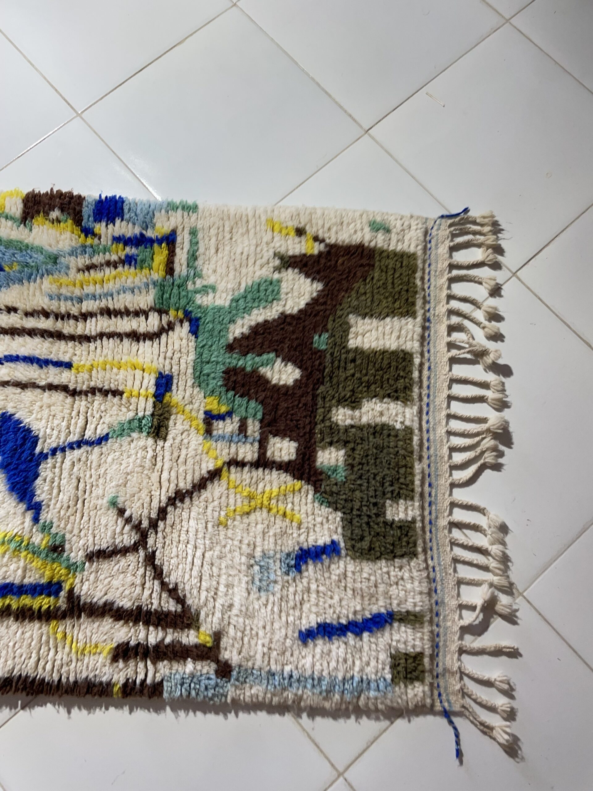 Authentic Moroccan Azilal rug, handwoven with bold geometric patterns and vibrant colors. Each piece is one-of-a-kind and ready to ship within 5–7 days. Perfect for brightening up your living room or bedroom.