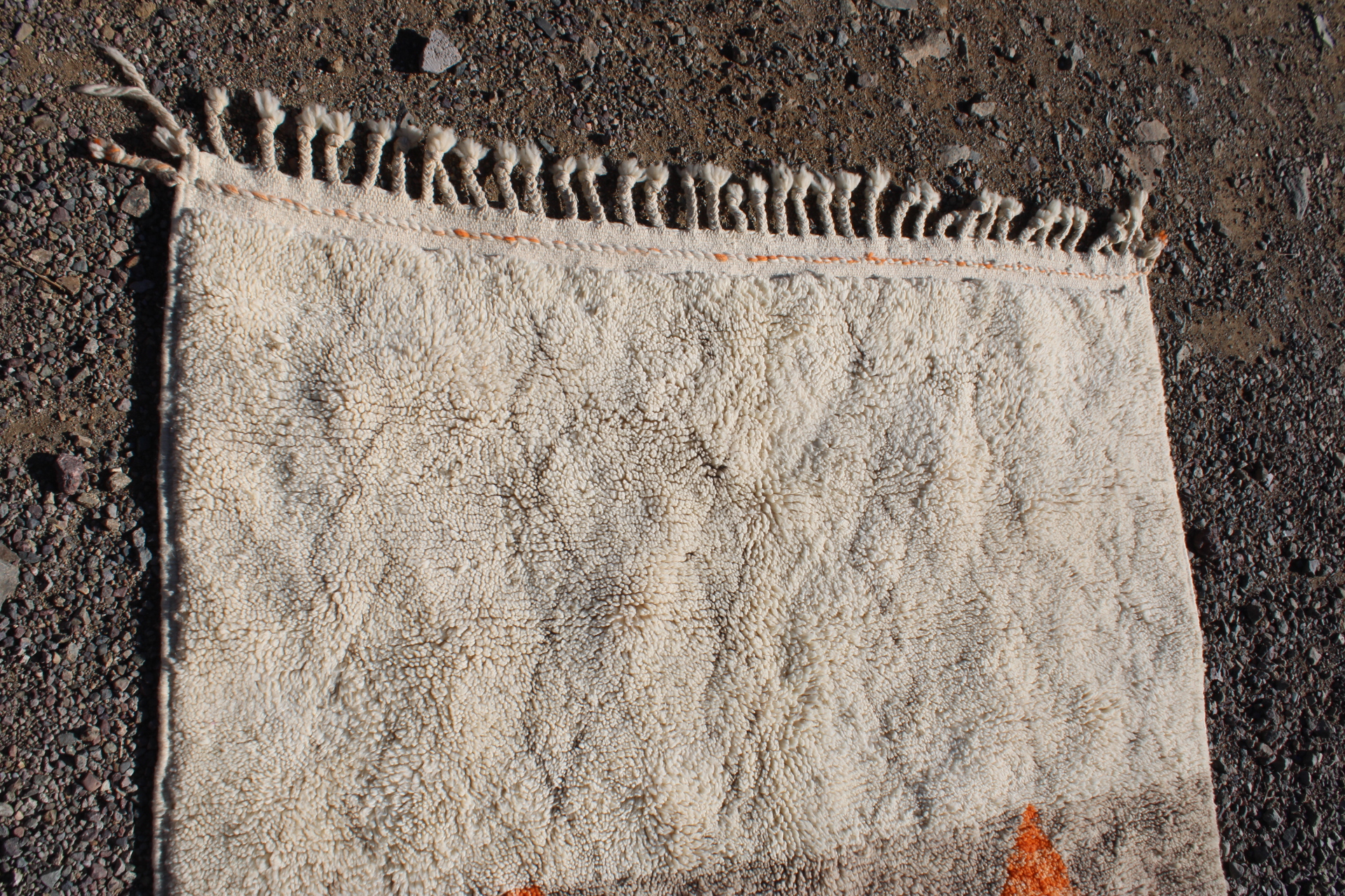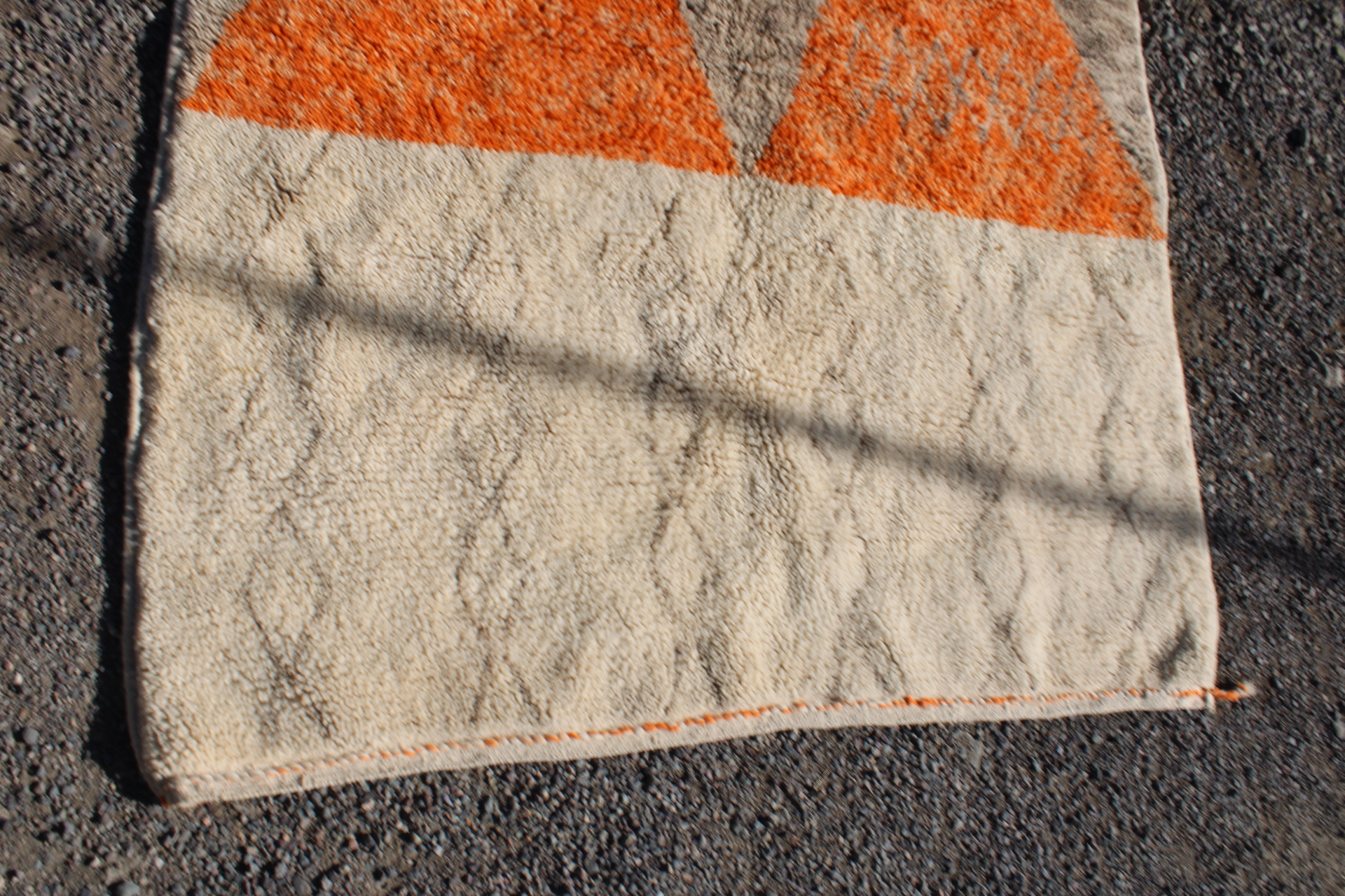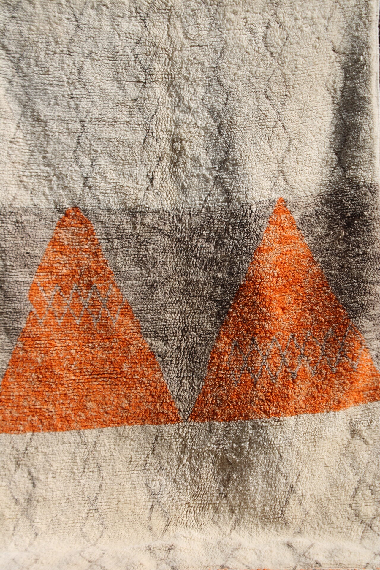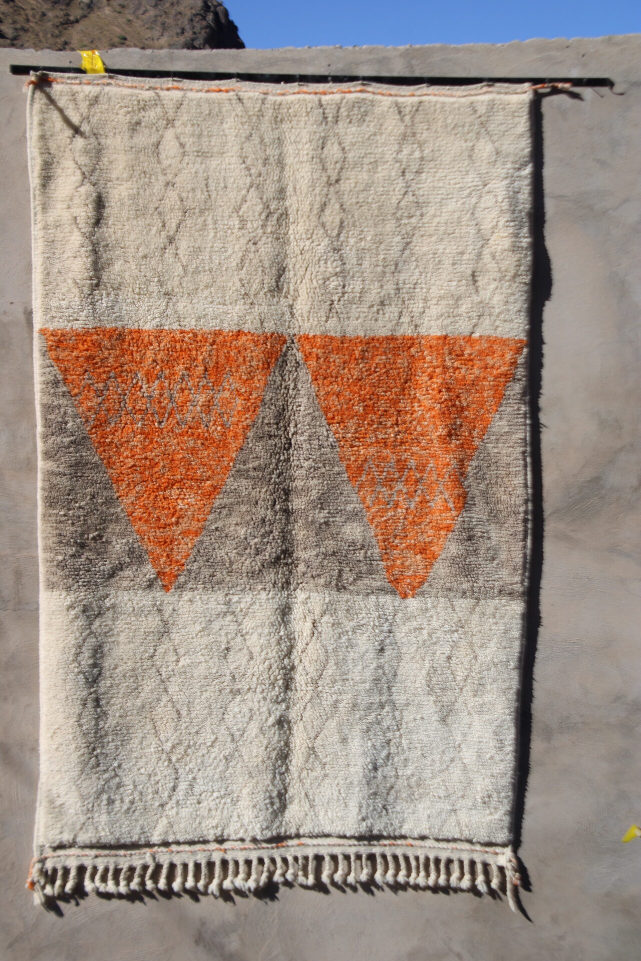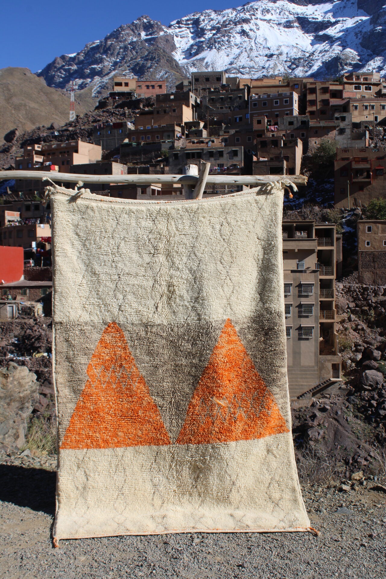The Tiwal rug is a beautifully handwoven Moroccan piece crafted by the artisans of Cooperative Adrar in the High Atlas mountains. Featuring two bold orange triangular motifs set against natural cream and grey tones, this rug blends minimalism with authentic Amazigh symbolism.